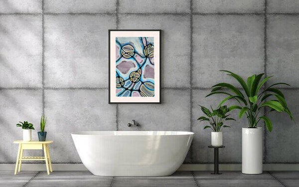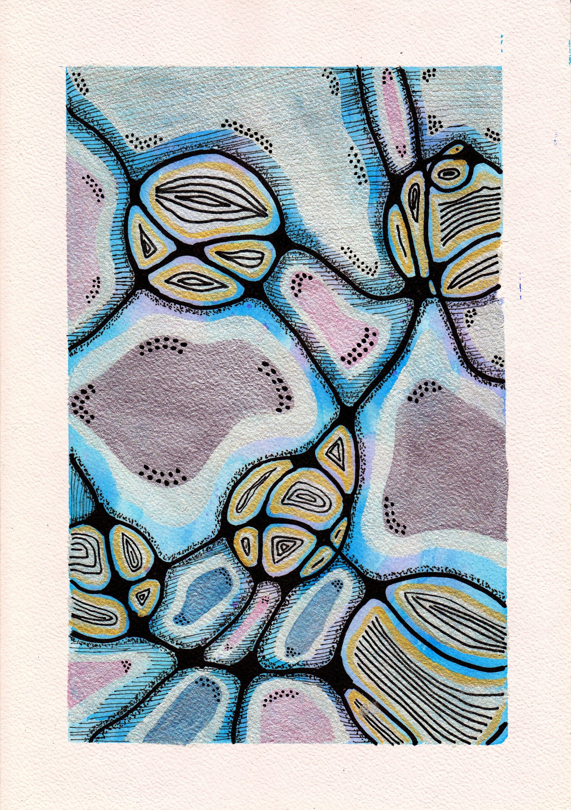 Glimmend is een abstract schilderij gemaakt in acrylverf op papier. De maat is A4. U ontvangt een origineel product, een lijst wordt niet meegeleverd.